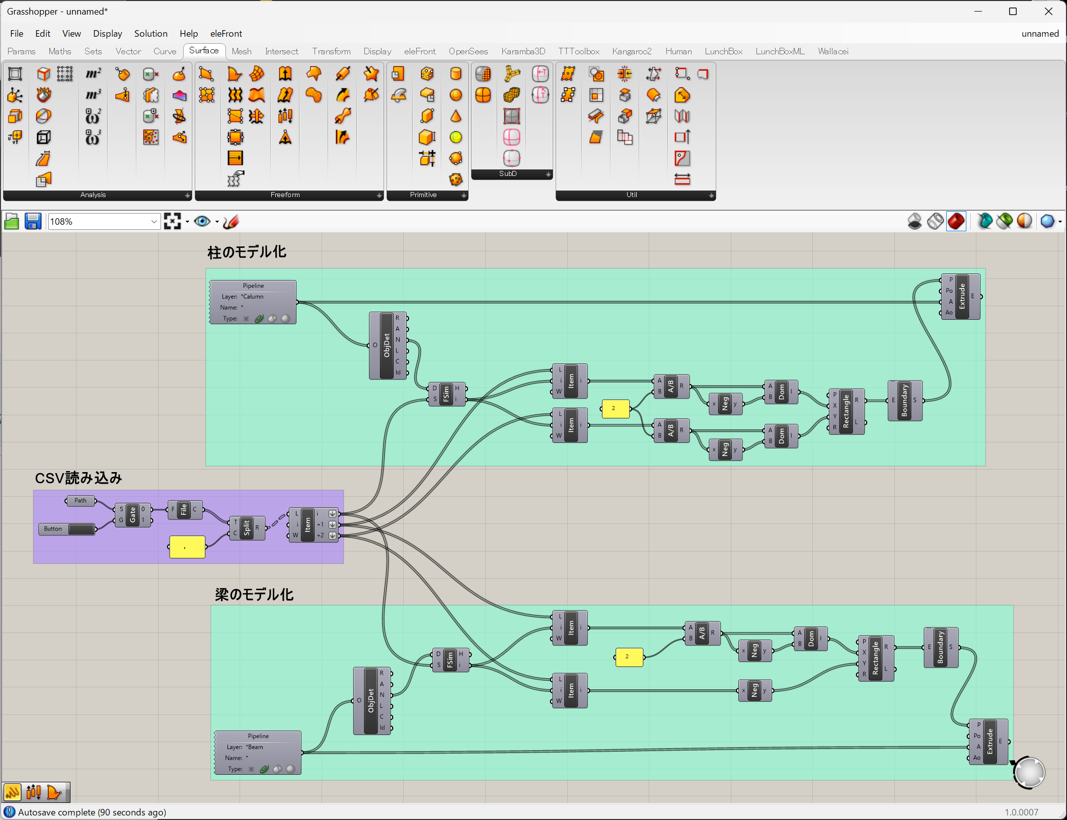 今回はCSVの読み込みを活用した、柱梁に断面情報を与え立体化するところまで行いました。
