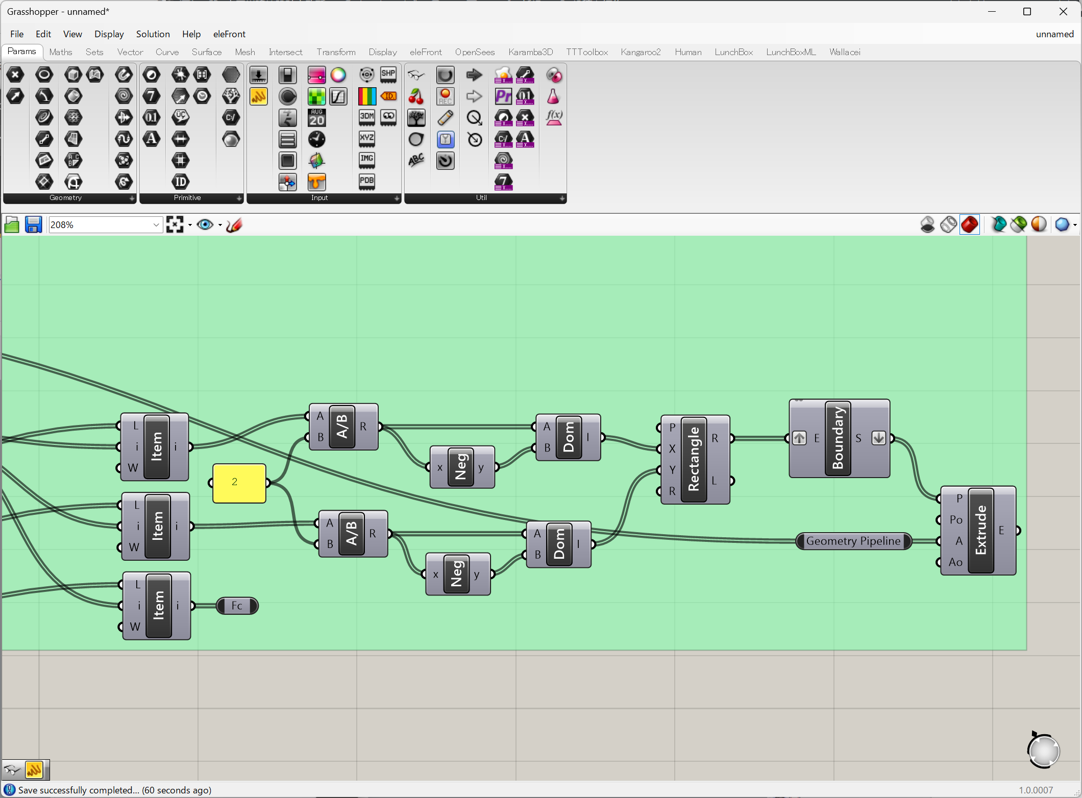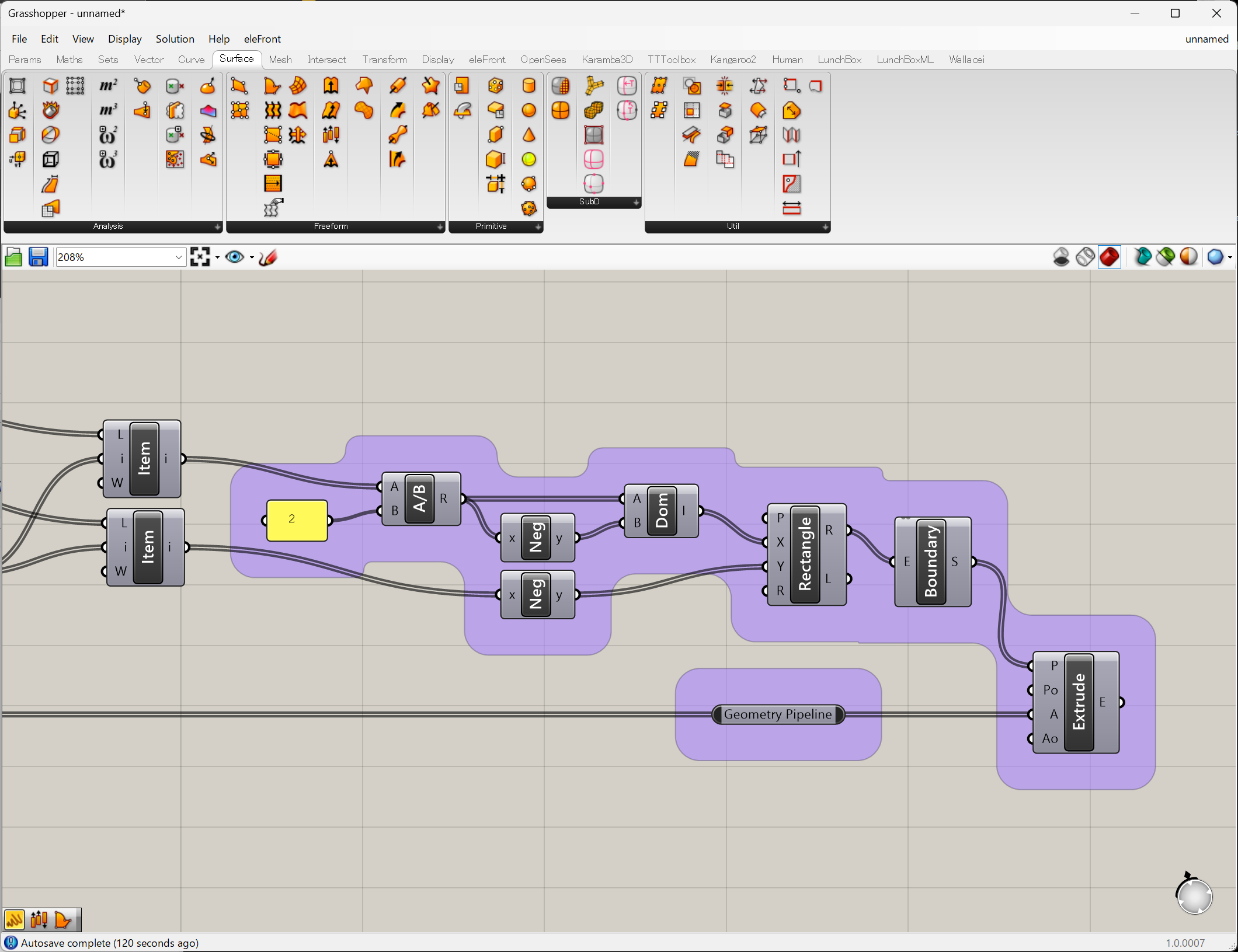 「Division」「Negative」「Construct Domain」「Rectangle」「Boundary Surfaces」「Extrude Linear」を用意します。