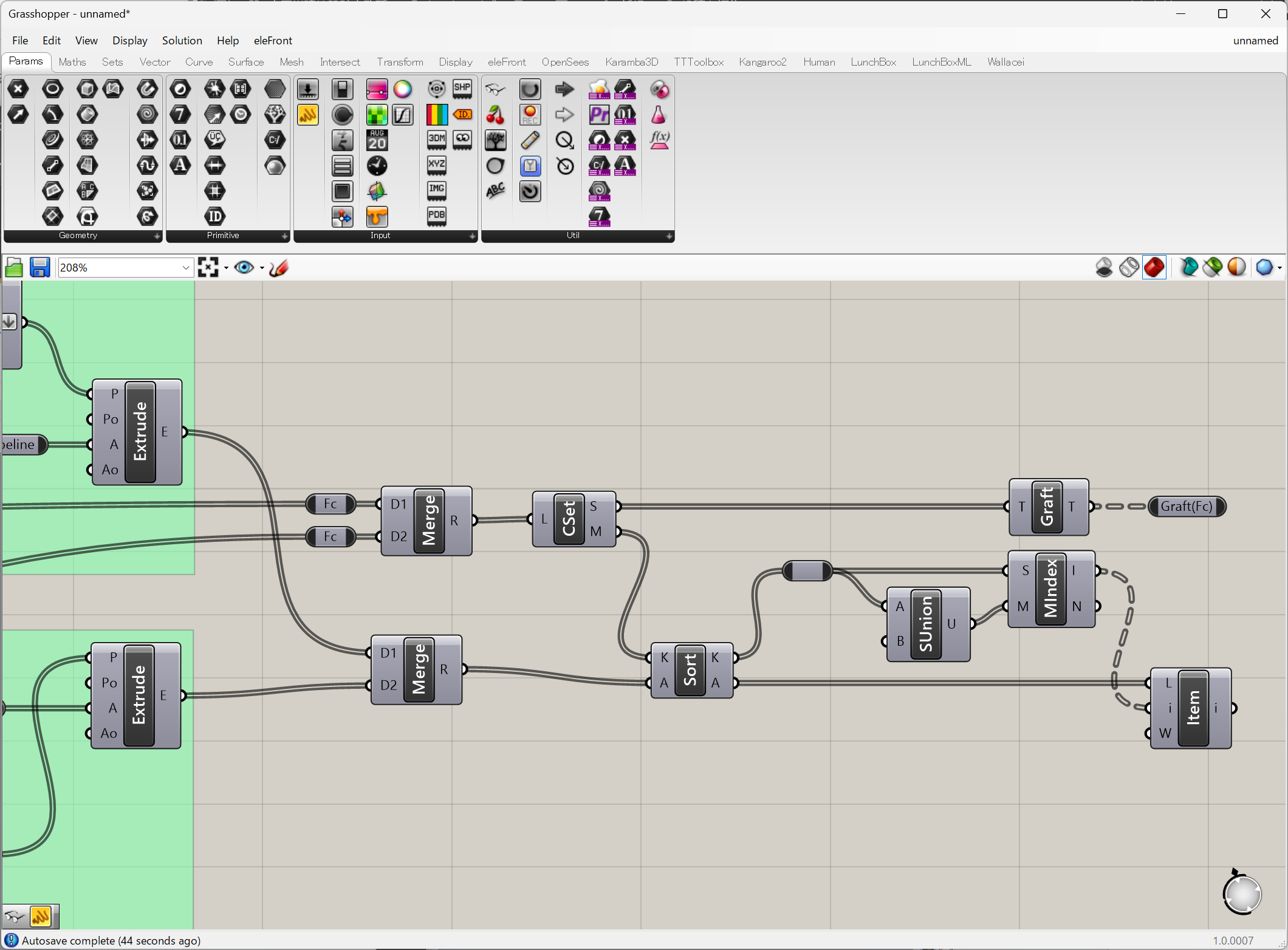 「Merge」「Create Set」「Sort List」「Set Union」「Member Index」「List Item」「Graft Tree」を用意します。