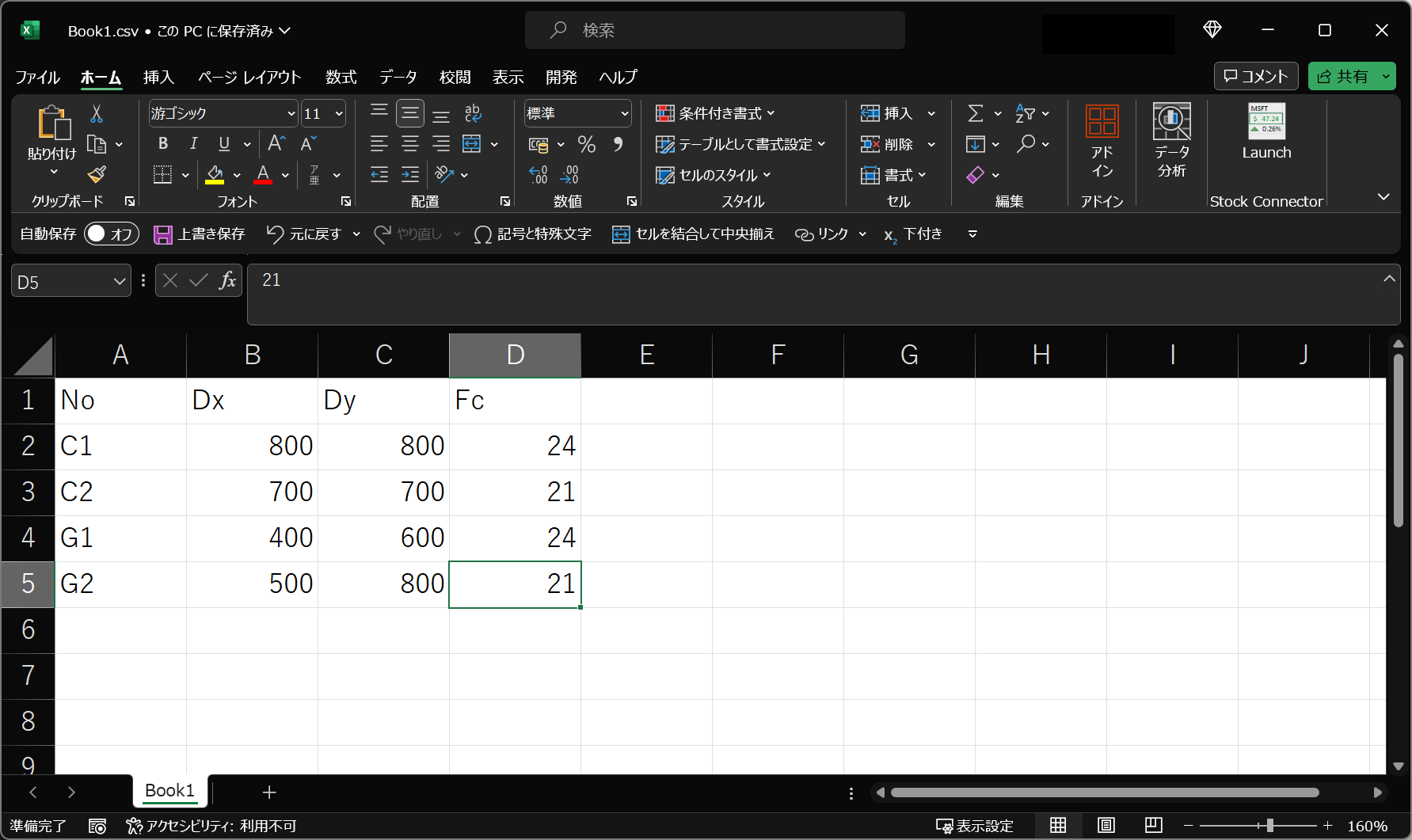 エクセル等を用いてCSVファイルに下のように入力しておきます。